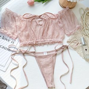 Delicado y femenino conjunto confeccionado en suave encaje floral, ideal para quienes buscan comodidad sin perder elegancia. Su diseño romántico realza la figura y aporta un toque sensual y sofisticado. 🔸 Incluye: Top de encaje con mangas cortas tipo off shoulder Colaless estilo tanga con tirantes ajustables y amarras laterales 🔸 Color: Rosa empolvado /…