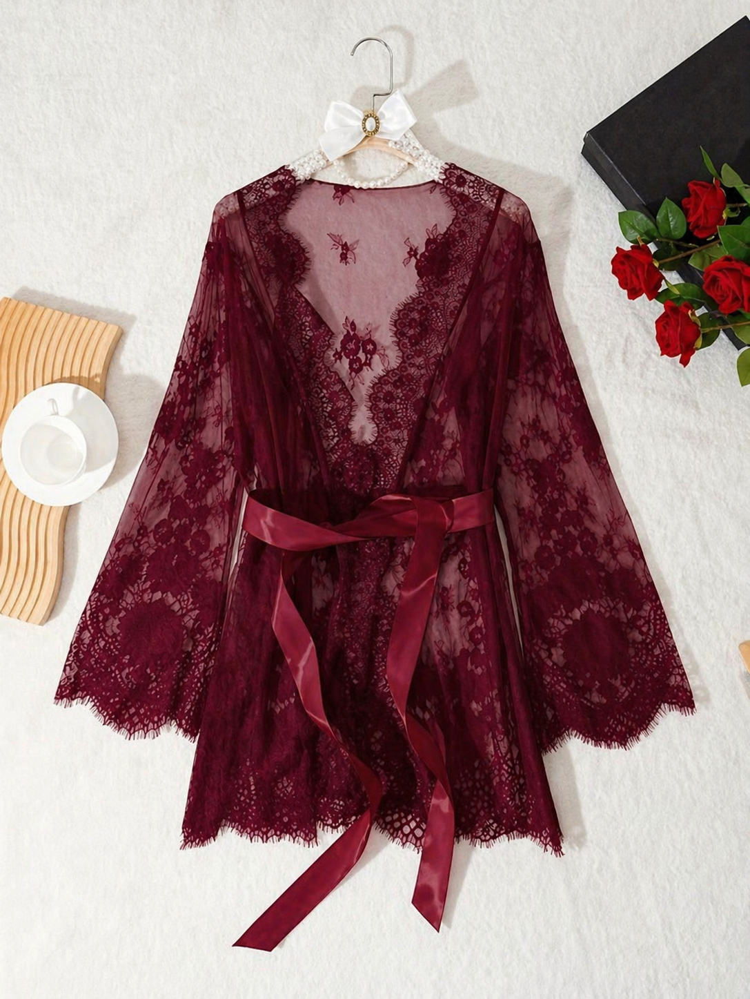 Bata de encaje vinotinto con cinturón – Talla M
