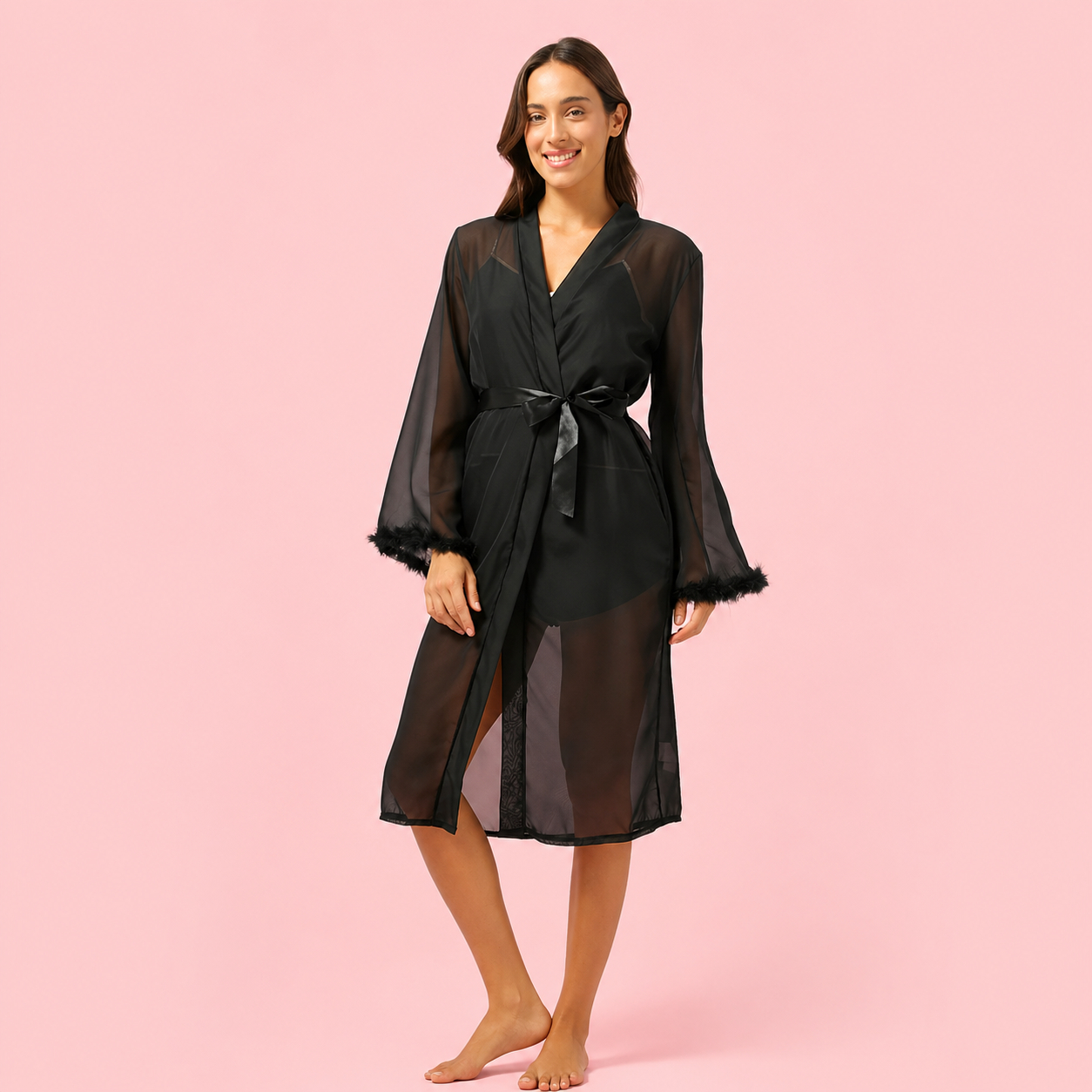 Bata ligera y elegante de tela translúcida, ideal para complementar tu lencería con un estilo sofisticado y cómodo. Su diseño incluye mangas amplias y cinturón para ajustar al cuerpo, adaptándose suavemente a la figura.