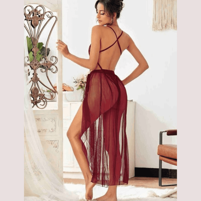 Prenda versátil que combina un body de encaje floral con una falda de gasa translúcida desmontable. Permite usarlo de dos formas: como conjunto completo tipo babydoll o solo como body, adaptándose a distintos estilos y ocasiones.