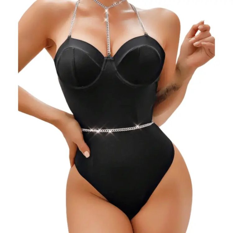 Body sensual de una sola pieza con diseño elegante que realza la figura. Confeccionado en material elástico que se adapta cómodamente al cuerpo, destaca por su detalle de cadena decorativa en cuello y cintura, aportando un estilo moderno y sofisticado. Cuenta con copas con forma para mayor realce y tirantes ajustables en la espalda para un mejor ajuste.