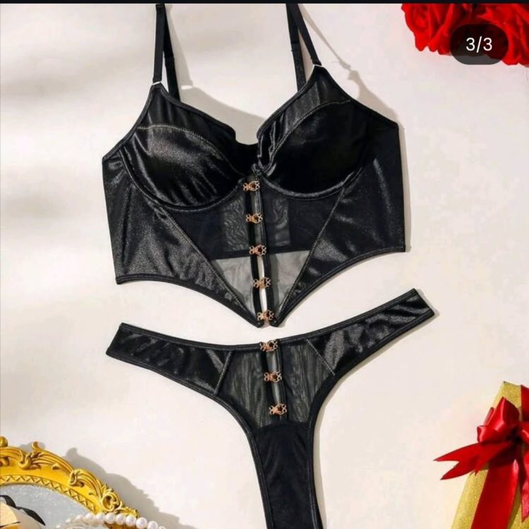Un diseño atrevido y sofisticado que mezcla la suavidad del satín con la sensualidad de la malla transparente. Los broches dorados añaden un detalle elegante y provocador.