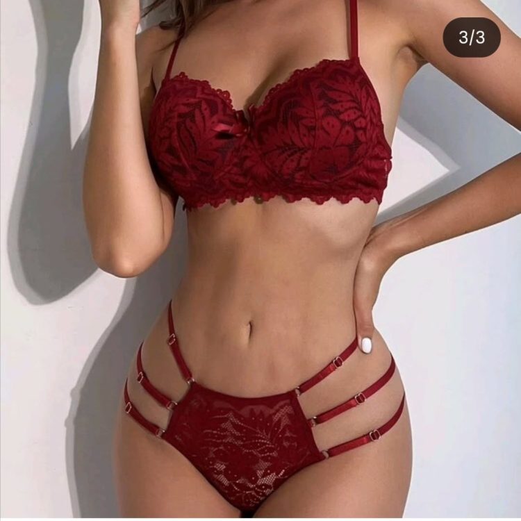 Este conjunto de lencería en tono vino intenso combina sensualidad y elegancia en una sola prenda. Confeccionado en encaje floral, resalta la silueta con un diseño moderno y atrevido.