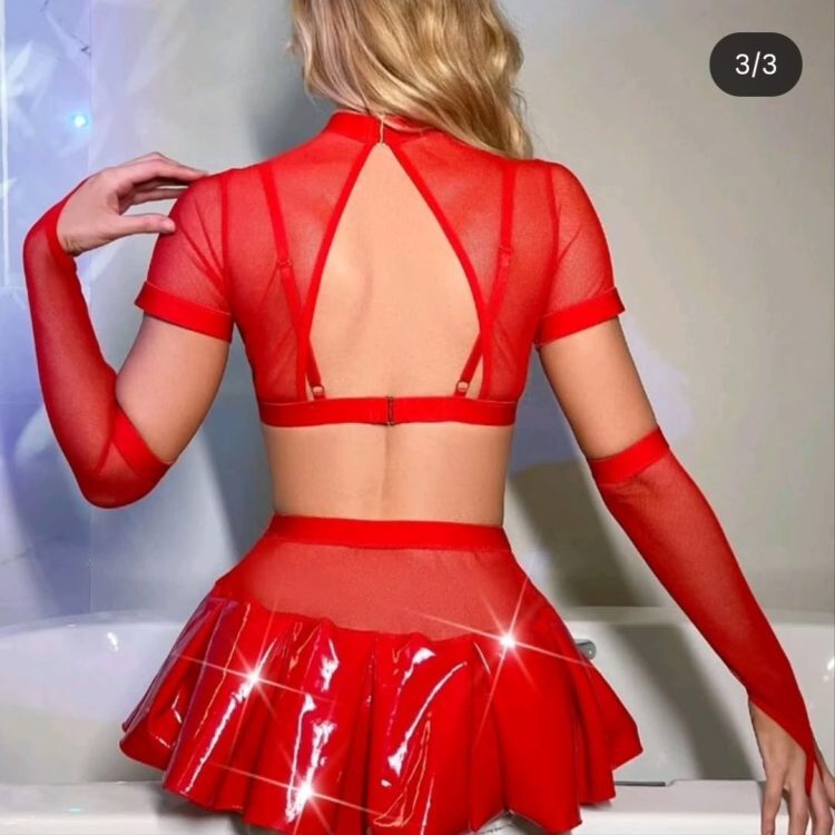 ✔️ Falda corta efecto vinilo brillante con pretina de malla.
