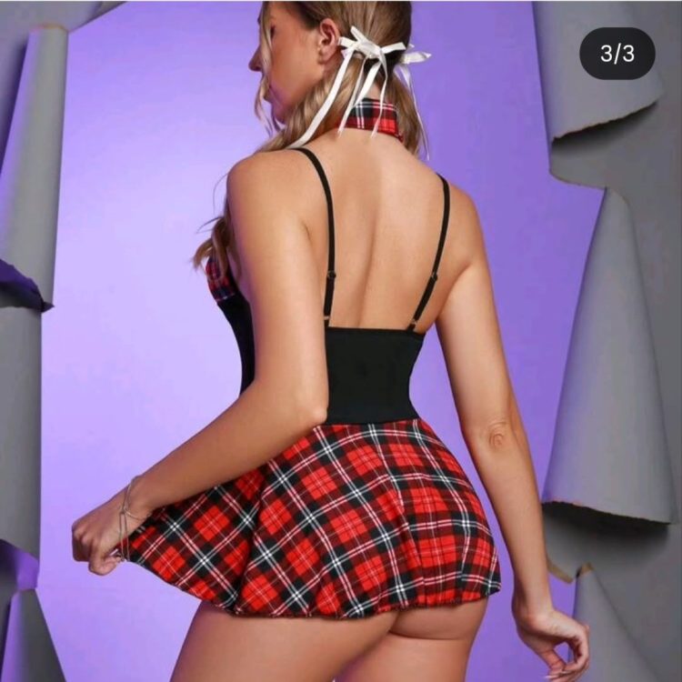 Incluye: Top, Colaless, Delantal, Collar, Pulsera, Ligas, Medias, Orejas.
