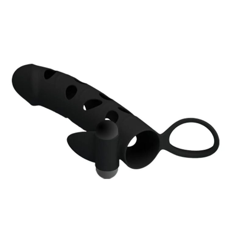 Enfunda tu pene erecto y disfruta de la textura sedosa de la silicona. Este extensor de pene tiene un anillo incorporado para los testículos y una bala vibradora en la base, agregando textura y vibración a tus experiencias sexuales.