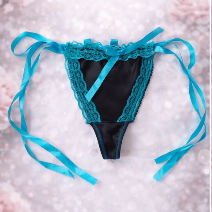 Presenta un diseño amplio y evasé, donde la prenda se va abriendo hacia la parte inferior, entregando una caída fluida y elegante. El borde inferior termina en forma levemente triangular, decorado con encaje delicado en tono claro y un pequeño lazo central, que aporta un detalle femenino y sutil.