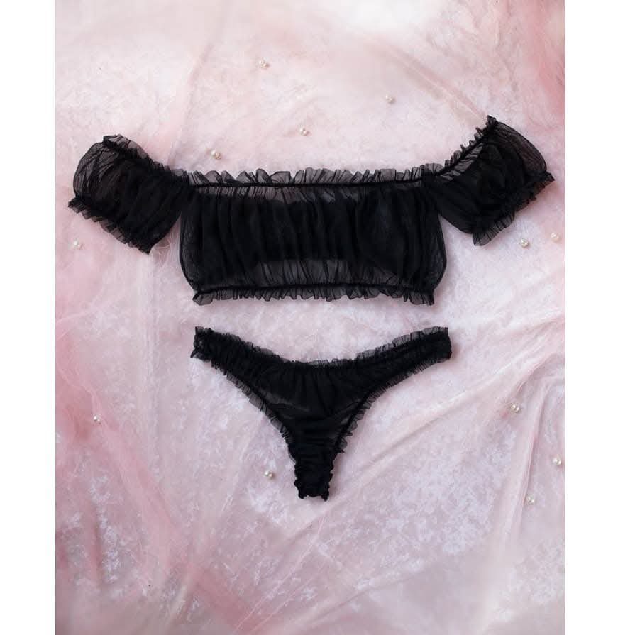 Conjunto de lencería en tono negro con delicados vuelos y diseño sensual. Incluye top con escote frontal y tirantes con detalle fruncido, calzón a juego con tiras cruzadas y acabado con vuelos.